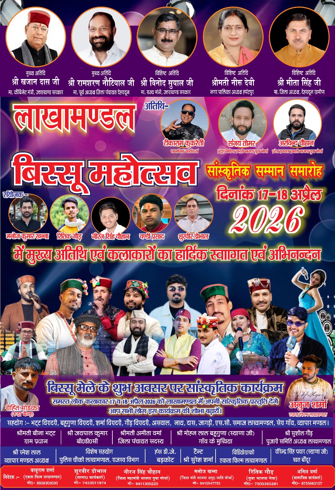 नौगांव : लाखामंडल का प्रसिद्ध विशू महोत्सव 17-18 अप्रैल लाखामंडल में आयोजित होगा। जिसमें जौनसारी, हिंमाचली, जौनपुर रवांई के दर्जनों गायक अपनी प्रस्तुती देगें। कार्यक्रम में मुख्य अतिथि कैबिनेट मंत्री खजान दास, पूर्व अध्यक्ष जिला पंचायत देहरादून रामशरण नौटियाल, विशिष्ट अतिथि राज्य मंत्री विनोद सुयाल, नगर पालिकाध्यक्ष हरबर्टपुर, मीता सिंह जिला अध्यक्ष, देहरादून ग्रामीण…