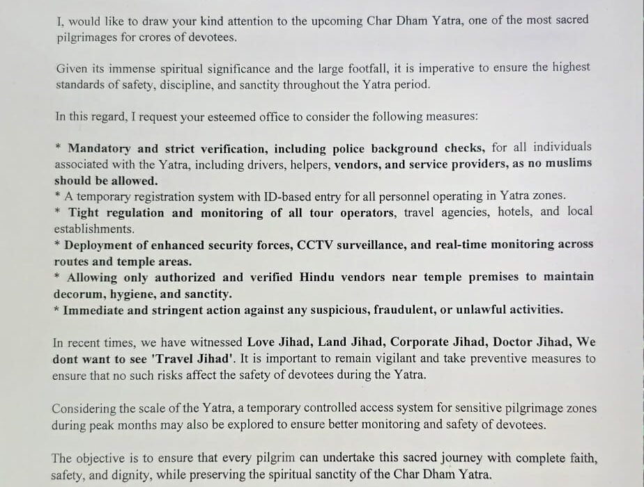 *चारधाम यात्रा में मुश्लिमों को न मिले अनुमति टी राजा नें लिखा मुख्यमंत्री पुष्कर सिंह धामी को पत्र*
