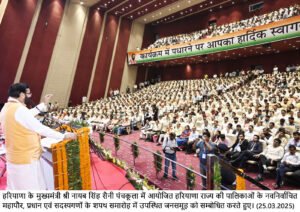 चंडीगढ़ 25 मार्च – हरियाणा के मुख्यमंत्री श्री नायब सिंह सैनी ने शहरी स्थानीय निकायों के नव निर्वाचित जन प्रतिनिधियों से आह्वान करते हुए कहा कि वे प्रधानमंत्री श्री नरेंद्र मोदी द्वारा शुरू किये गए बेटी बचाओ बेटी पढ़ाओ अभियान के तहत जागरुकता बढ़ाने, स्वच्छता अभियान को गति देने सहित नशे के विरुद्ध चल रहे निर्णायक युद्ध में दलगत राजनीति से ऊपर उठकर पूरी निष्ठा और समर्पण के साथ मिशन मोड में कार्य करने का संकल्प ले।