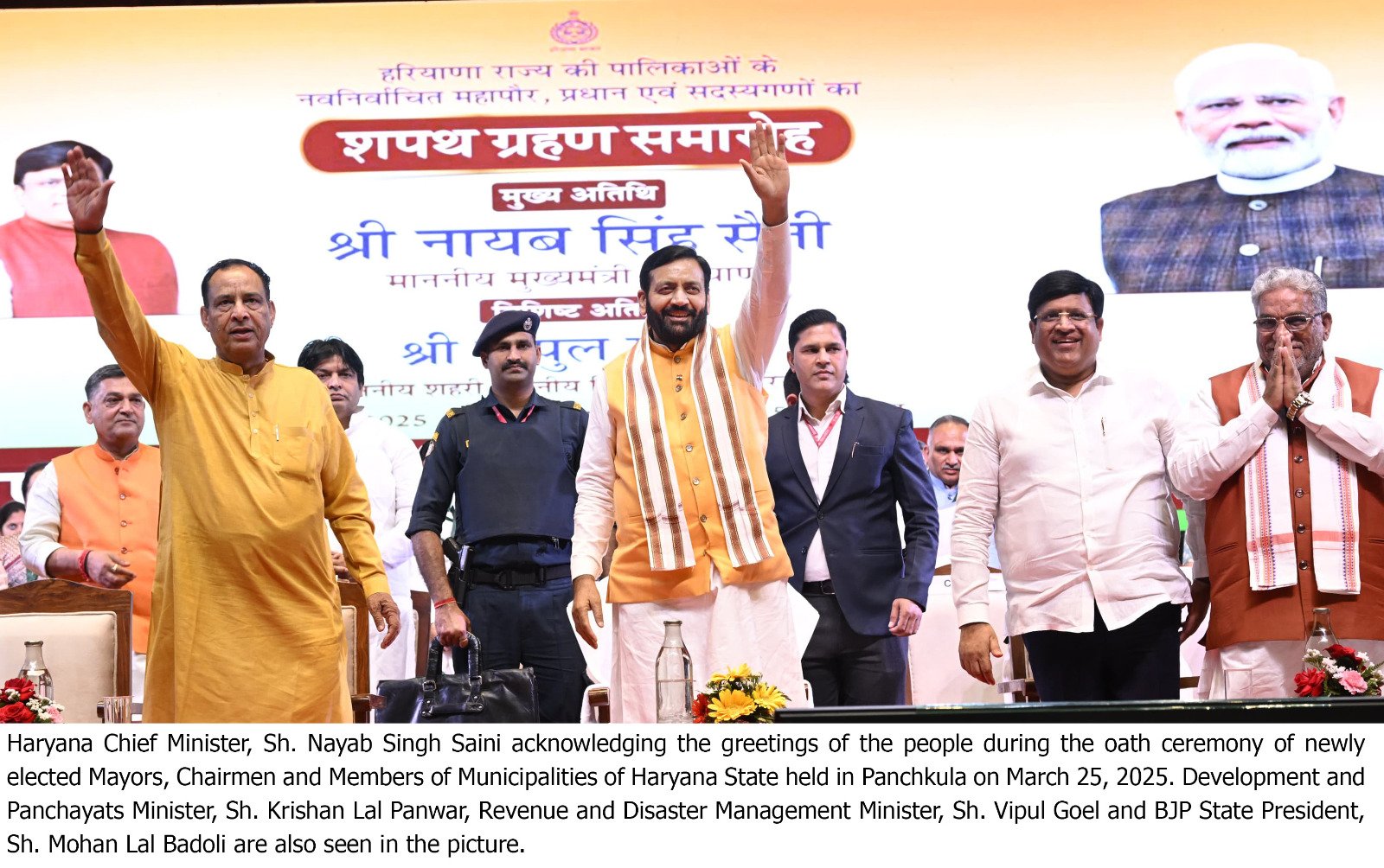 शहरी सरकार के सभी नवनिर्वाचित महापौरों, नगर परिषद व नगर पालिकाओं के अध्यक्षों और सदस्यों को बधाई देते हुए मुख्यमंत्री ने कहा कि हाल ही में संपन्न निकाय चुनाव में यह सिद्ध हो गया है कि प्रदेश के लोग विकास, पारदर्शिता और सुशासन चाहते हैं। उन्होंने सभी प्रतिनिधियों से आग्रह करते हुए कहा कि वे शहरों को समृद्ध, स्वच्छ, सुरक्षित, नशा मुक्त और आत्मनिर्भर बनाने का कार्य करेंगे। साथ ही मुख्यमंत्री ने आश्वासन देते हुए कहा कि प्रदेश की प्रगति के इस सफर में हरियाणा सरकार सदैव सहयोग के लिए तैयार रहेगी।