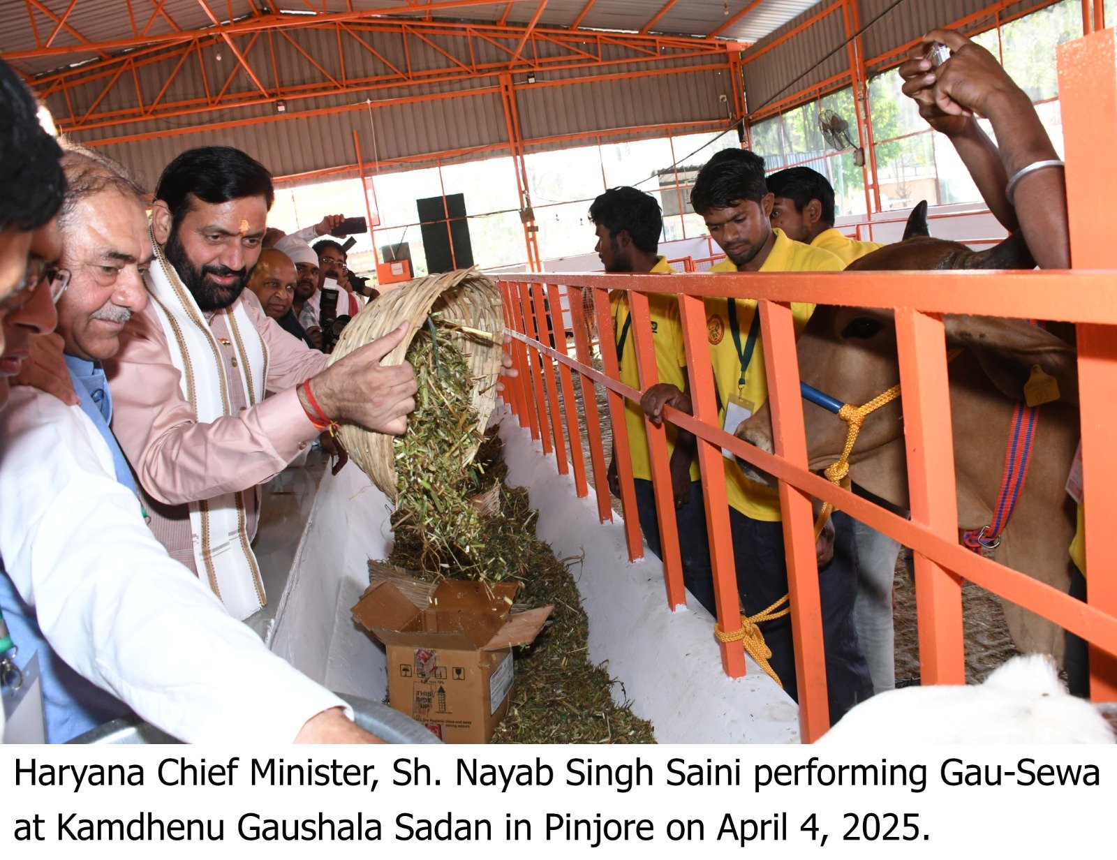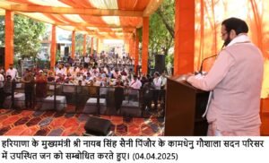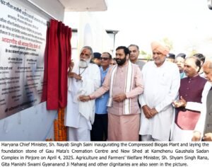 पंचकूला, 4 अप्रैल – हरियाणा के मुख्यमंत्री श्री नायब सिंह सैनी ने शुक्रवार को जिला पंचकूला के पिंजौर स्थित कामधेनु गौशाला सेवा सदन द्वारा आयोजित कार्यक्रम में बतौर मुख्य अतिथि शिरकत की और इस दौरान उन्होंने गौसेवा भी की। उन्होंने कामधेनु गौशाला में गौमाता के गोबर से निर्मित कम्प्रेस्ड बायोगैस प्लांट का लोकार्पण व गौमाता के अंतिम संस्कार केंद्र एवं नए शैड का शिलान्यास किया। उन्होंने कामधेनु गौशाला सेवा सदन को 21 लाख रूप्ये देने की घोषणा की।