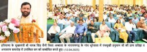 चंडीगढ़, 12 अप्रैल — हरियाणा के मुख्यमंत्री श्री नायब सिंह सैनी ने आज श्री हनुमान जन्मोत्सव के अवसर जिला अंबाला के गांव भूरेवाला स्थित एसआरएम कॉलेज परिसर में 31 फूट ऊंची पंचमुखी हनुमान जी की प्रतिमा की प्राण—प्रतिष्ठा एवं अनावरण कार्यक्रम में बतौर मुख्यातिथि शिरकत की। इस अवसर पर मुख्यमंत्री ने प्रदेशवासियों को हनुमान जन्मोत्सव की बधाई एवं शुभकामनाएं देते हुए प्रदेशवासियों के सुख, समृद्धि एवं खुशहाली की कामना की।