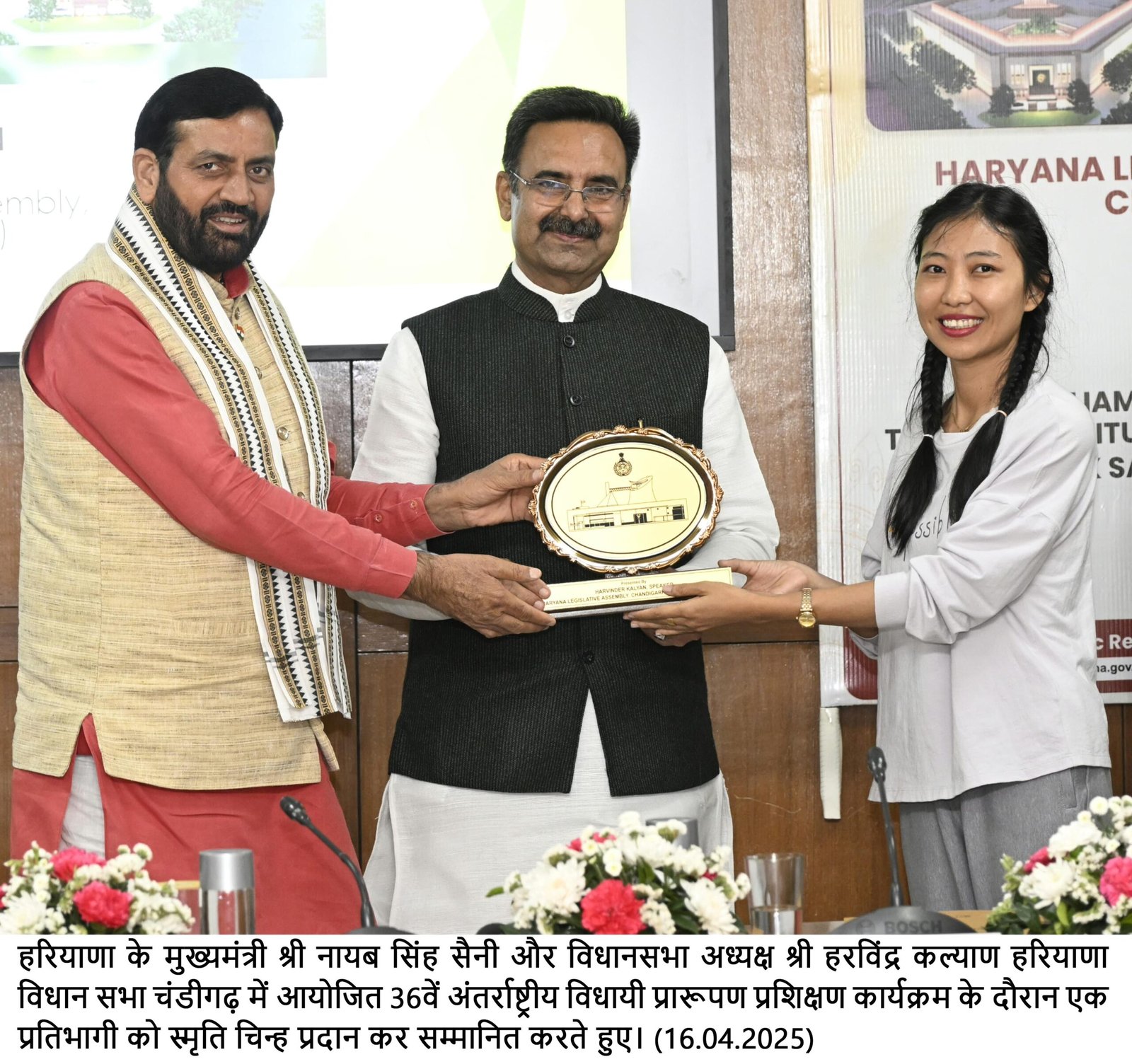 इस अवसर पर मुख्यमंत्री श्री नायब सिंह सैनी और विधानसभा अध्यक्ष श्री हरविंदर कल्याण ने प्रशिक्षण कार्यक्रम के प्रतिभागियों को स्मृति चिन्ह भेंट कर सम्मानित भी किया।