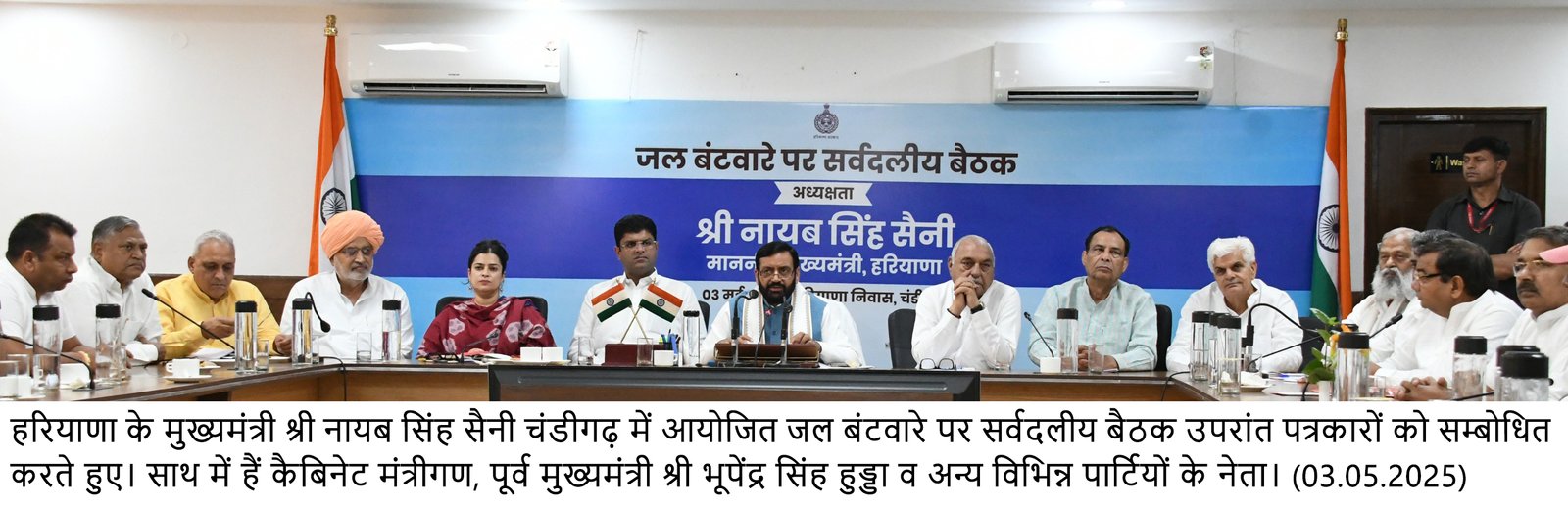 चंडीगढ़, 3 मई – हरियाणा और पंजाब के मध्य चल रहे जल विवाद पर आज मुख्यमंत्री श्री नायब सिंह सैनी की अध्यक्षता में सर्वदलीय बैठक हुई, जिसमें हरियाणा के हितों की सुरक्षा के लिए सर्वसम्मति से प्रस्ताव पास करके पंजाब सरकार से आग्रह किया गया कि बीबीएमबी की तकनीकी समिति के 23 अप्रैल, 2025 के तथा बीबीएमबी बोर्ड के 30 अप्रैल, 2025 के फैसलों को बिना शर्त लागू किया जाए। हरियाणा को मिलने वाले पानी के हिस्से पर लगाई गई अमानवीय, अनुचित, अवैध एवं असंवैधानिक रोक को तुरंत हटाया जाए।