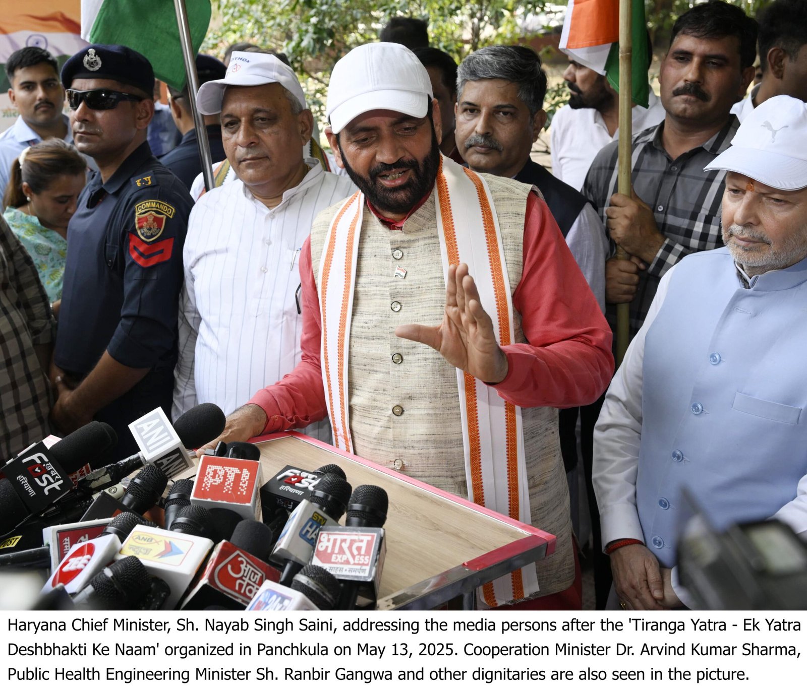 चण्डीगढ़, 13 मई – हरियाणा के मुख्यमंत्री श्री नायब सिंह सैनी ने कहा कि आज विश्व के सामने पाकिस्तान का चेहरा बेनकाब हो गया हैैैै कि वह एक आतंकवाद प्रायोजित देश है, जो आतंकवाद को जन्म देता है। आतंकवाद के खिलाफ भारत देश ने सख्त कार्रवाई की है। हम किसी व्यक्ति के खिलाफ नहीं, हम आतंकवाद के खिलाफ हैं। हमारी सेना ने पहले सर्जिकल स्ट्राइक, फिर एयर स्ट्राइक और अब ऑपरेशन सिंदूर के माध्यम से आतंकवादियों के ठिकानों को नष्ट किया है।