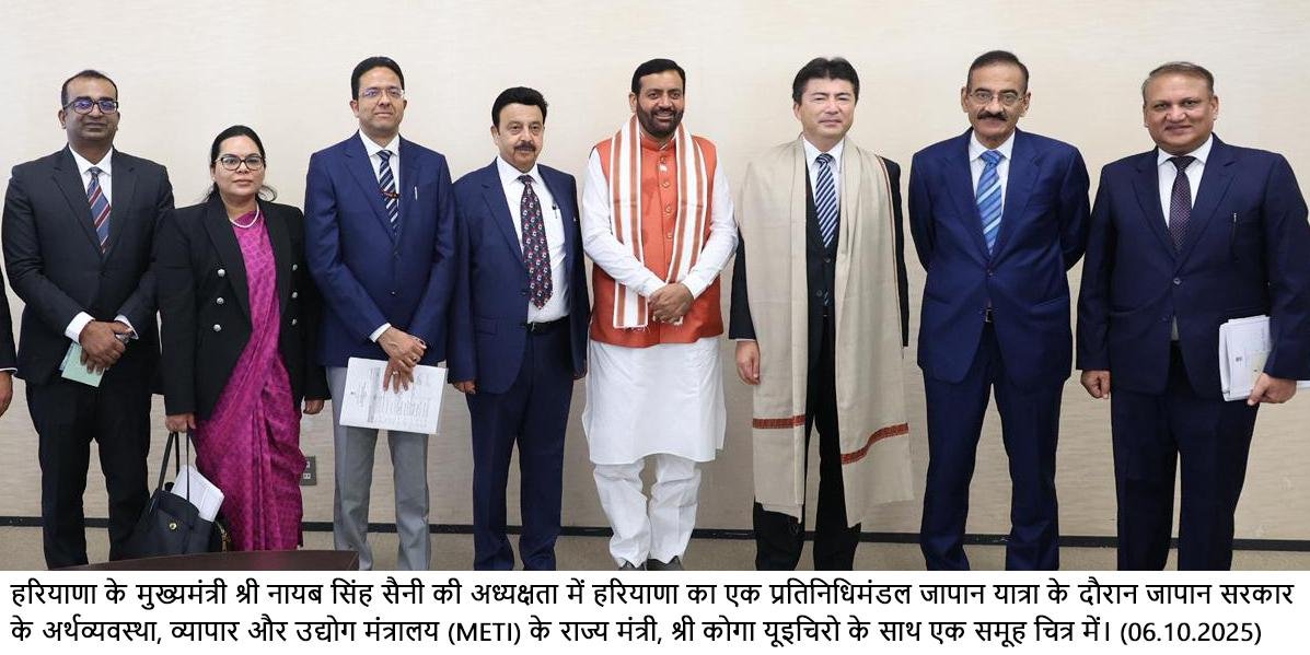 नई दिल्ली, 6 अक्तूबर — हरियाणा के मुख्यमंत्री श्री नायब सिंह सैनी के नेतृत्व में जापान के दौरे पर गए उच्चस्तरीय प्रतिनिधिमंडल ने आज टोक्यो में जापान के वरिष्ठ मंत्रियों के साथ द्विपक्षीय चर्चाएं कीं। बैठकों के दौरान हरियाणा और जापान के बीच आर्थिक, औद्योगिक एवं सांस्कृतिक सहयोग को बढ़ावा देने और सुदृढ़ करने पर विस्तृत चर्चा हुई। इस दौरान हरियाणा के उद्योग एवं वाणिज्य मंत्री राव नरबीर सिंह भी उपस्थित रहे।