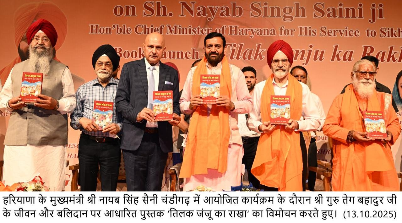 मुख्यमंत्री ने चंडीगढ़ के सेक्टर 18 स्थित टैगोर थियेटर में आयोजित कार्यक्रम में बतौर मुख्य अतिथि शिरकत की। इस अवसर पर मुख्यमंत्री ने श्री गुरु तेग बहादुर जी को नमन करते हुए कहा कि आज का यह अवसर मेरे लिए अत्यंत प्रेरणादायी और हृदयस्पर्शी है। जब हम हिंद की चादर नौवें पातशाह श्री गुरु तेग बहादुर जी के जीवन पर आधारित पुस्तक के विमोचन के साक्षी बने हैं।