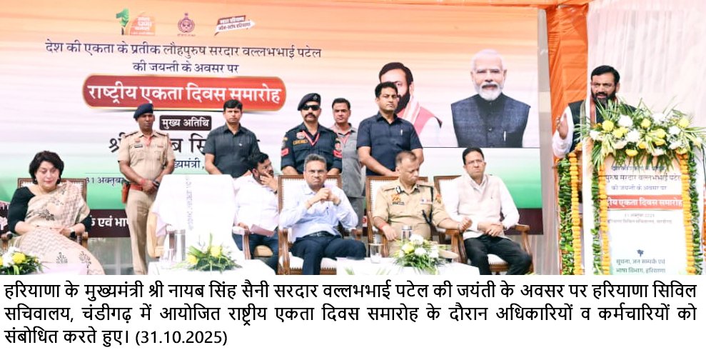 मुख्यमंत्री सैनी ने कहा कि राष्ट्रीय एकता दिवस केवल एक स्मरण दिवस नहीं, बल्कि यह हर भारतीय को एकता, अखंडता और सुरक्षा के संकल्प को दोहराने का अवसर प्रदान करता है। उन्होंने कहा कि हरियाणा के अधिकारी और कर्मचारी सरदार पटेल की कार्यशैली, अनुशासन और सेवा भावना से प्रेरणा लेकर राष्ट्र निर्माण में अपनी भूमिका निभाएं।