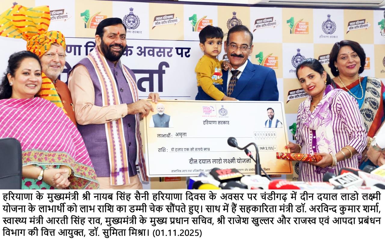 हरियाणा दिवस के अवसर पर मुख्यमंत्री ने दीनदयाल लाड़ो लक्ष्मी योजना की पहली किस्त के तहत 5,22,162 महिलाओं के खातों में 109 करोड़ 65 लाख 40 हजार 200 रुपये की राशि डिजिटल माध्यम से स्थानांतरित की। उन्होंने कहा कि यह योजना महिलाओं के आर्थिक सशक्तिकरण की दिशा में ऐतिहासिक कदम है।