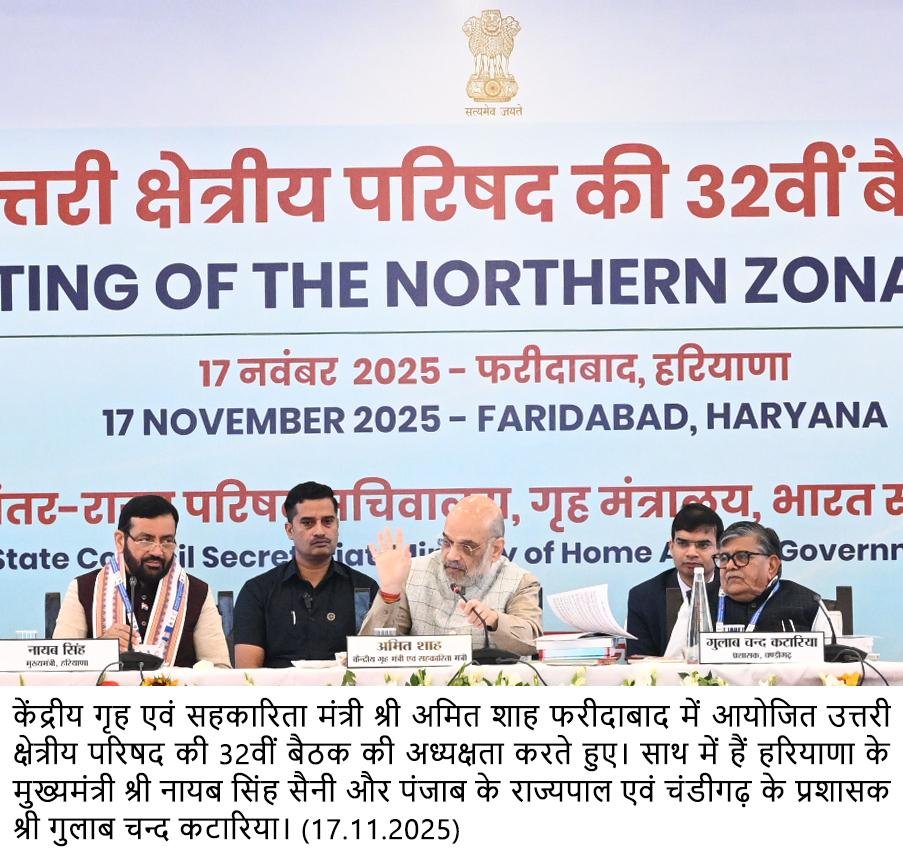नई दिल्ली 17 नवंबर – केन्द्रीय गृह एवं सहकारिता मंत्री श्री अमित शाह ने आज हरियाणा के फरीदाबाद में उत्तरी क्षेत्रीय परिषद की 32वीं बैठक की अध्यक्षता की। बैठक में हरियाणा के मुख्यमंत्री श्री नायब सिंह सैनी, पंजाब के मुख्यमंत्री श्री भगवंत मान, हिमाचल प्रदेश के मुख्यमंत्री श्री सुखविंद्र सिंह सुक्खू, राजस्थान के मुख्यमंत्री श्री भजन लाल शर्मा, जम्मू-कश्मीर के मुख्यमंत्री श्री उमर अब्दुल्ला, दिल्ली की मुख्यमंत्री श्रीमती रेखा गुप्ता, संघ शासित प्रदेश चंडीगढ़ के प्रशासक श्री गुलाब चंद कटारिया, जम्मू-कश्मीर के उप-राज्यपाल श्री मनोज सिन्हा, दिल्ली के उपराज्यपाल श्री विनय कुमार सक्सेना और लद्दाख के उप-राज्यपाल श्री कविंदर गुप्ता तथा इन राज्यों एवं संघशासित प्रदेशों के वरिष्ठ मंत्री भी शामिल हुए। बैठक में केन्द्रीय गृह सचिव, अंतर राज्य परिषद सचिवालय के सचिव, सदस्य राज्यों के मुख्य सचिव/ सलाहकार और राज्य सरकारों तथा केन्द्रीय मंत्रालयों एवं विभागों के वरिष्ठ अधिकारी भी उपस्थित थे।