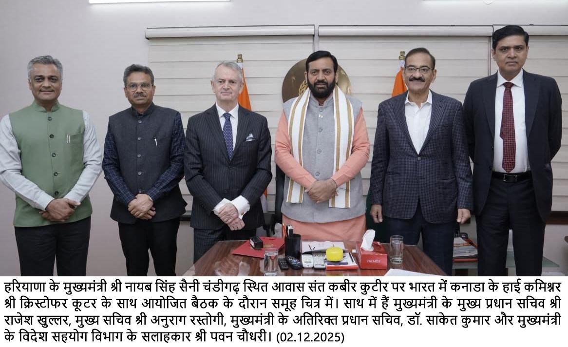 चंडीगढ़, 2 दिसंबर — हरियाणा के मुख्यमंत्री श्री नायब सिंह सैनी के नेतृत्व में राज्य सरकार हरियाणा को शिक्षा के क्षेत्र में वैश्विक हब बनाने के लगातार प्रयास कर रही है। इन्हीं प्रयासों की कड़ी में मंगलवार को भारत में कनाडा के राजदूत क्रिस्टोफर कूटर ने मुख्यमंत्री श्री नायब सिंह सैनी से उनके निवास स्थान संत कबीर कुटीर पर शिष्टाचार भेंट की।