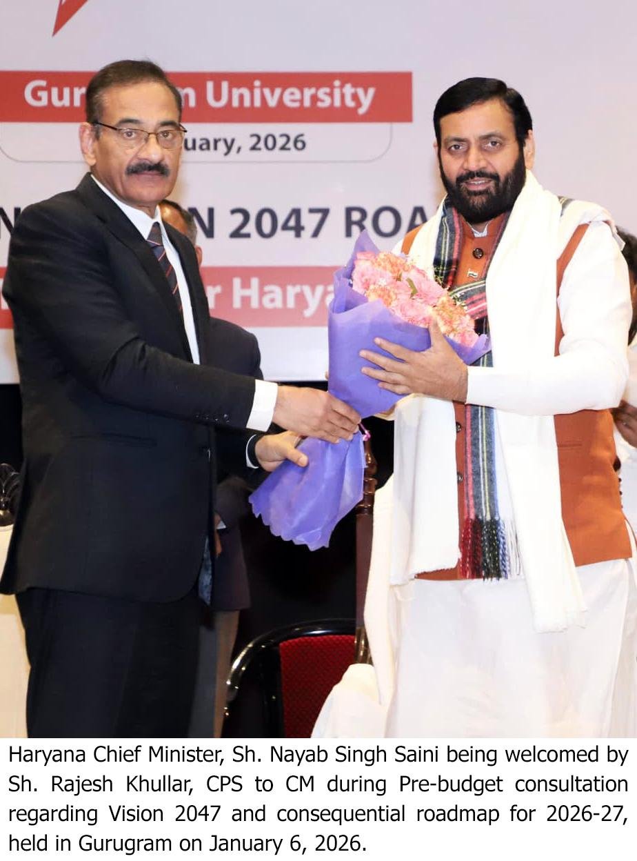 मुख्यमंत्री ने हरियाणा विज़न 2047 रोडमैप के ध्येय के साथ वित्त वर्ष 2026- 27 के लिए इंडस्ट्री, हेल्थ, आईटी तथा एजुकेशन सेक्टर से संबंधित हितधारकों के साथ आयोजित बजट पूर्व परामर्श बैठक (प्री बजट कंसल्टेशन) में हर पहलू पर विस्तार से चर्चा की। बैठक में उद्योग जगत एवं मैन्यूफैक्चरिंग इकाइयों से जुड़े विभिन्न संगठनों के प्रतिनिधियों ने आगामी बजट के लिए अपने सुझाव रखे। बैठक में प्रदेश के उद्योग एवं वाणिज्य, पर्यावरण, वन एवं वन्य जीव मंत्री राव नरबीर सिंह, पटौदी की विधायक बिमला चौधरी, गुरुग्राम के विधायक मुकेश शर्मा सहित अन्य वरिष्ठ अधिकारी मौजूद रहे।