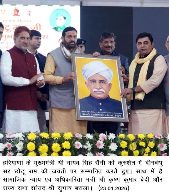 चंडीगढ़ 23 जनवरी- हरियाणा के मुख्यमंत्री श्री नायब सिंह सैनी ने कहा कि दीनबंधु चौधरी छोटूराम के संघर्ष के चलते धरती पुत्र किसान का भाग्य बदला और मजदूर की तकदीर भी बदली। कृषि भूमि की रक्षा, किसान की गरिमा और मेहनतकश की इज्जत ही दीनबंधु चौधरी छोटूराम के जीवन के मूल मंत्र थे। इन्हीं मूल मंत्रों को आधार मानकर डबल इंजन सरकार किसानों का सम्मान और सशक्तिकरण कर रही है।