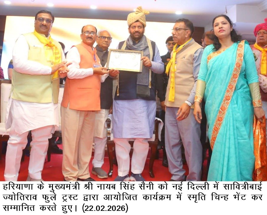 नई दिल्ली, 22 फरवरी- हरियाणा के मुख्यमंत्री श्री नायब सिंह सैनी ने रविवार को दिल्ली के मंगोलपुरी में अंतरराष्ट्रीय सैनी भवन का उद्घाटन किया। उन्होंने इस भवन में स्थापित की गई महात्मा बुद्ध, महात्मा ज्योतिराव फुले, माता सावित्री बाई फुले, महाराज शूर सैन की प्रतिमाओं का भी अनावरण किया। उन्होंने सावित्रीबाई ज्योतिराव फुले ट्रस्ट को 51 लाख रूपये देने की घोषणा भी की।