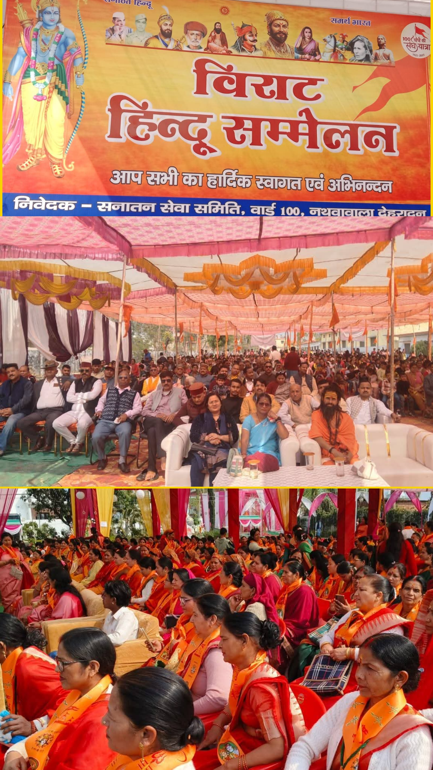 देहरादून, 22 फरवरी। देहरादून के नथुवावाला मे आयोजित विराट हिंदू सम्मेलन आस्था, संस्कृति, सामाजिक समरसता और राष्ट्रीय चेतना का विराट संगम बनकर उभरा। हिंदुत्व, राष्ट्रीय एकता और सांस्कृतिक धरोहर के संरक्षण के उद्देश्य से आयोजित इस ऐतिहासिक सम्मेलन में हजारों श्रद्धालुओं, मातृशक्ति, युवाओं और विभिन्न सामाजिक संगठनों ने भाग लिया। सम्मेलन राष्ट्रीय स्वयंसेवक संघ के शताब्दी वर्ष की पृष्ठभूमि में आयोजित किया गया, जिसमें राष्ट्र निर्माण में जनमानस की भूमिका, अखंडता, स्वदेशी और पर्यावरण संरक्षण जैसे विषयों पर विशेष फोकस रहा।