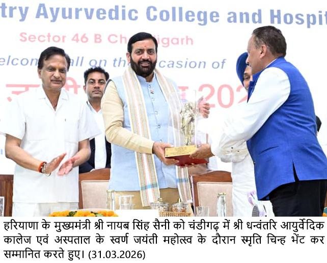 चंडीगढ़ 31 मार्च — हरियाणा के मुख्यमंत्री श्री नायब सिंह सैनी ने चंडीगढ़ में आयोजित श्री धन्वंतरि आयुर्वेदिक कॉलेज एवं अस्पताल के स्वर्ण जयंती समारोह को संबोधित करते हुए कहा कि आधुनिक जीवनशैली से उत्पन्न तनाव, मधुमेह, उच्च रक्तचाप और अन्य जीवनशैली संबंधी रोगों के समाधान में आयुर्वेद एक प्रभावी और टिकाऊ विकल्प प्रदान करता है। आयुर्वेद में शारीरिक स्वास्थ्य के साथ-साथ मानसिक और आध्यात्मिक संतुलन पर भी बल दिया जाता है।